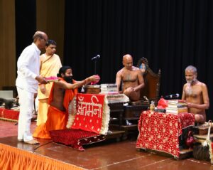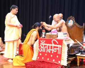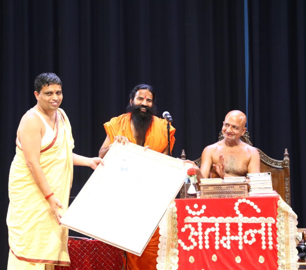 इस गरिमामय अवसर पर पतंजलि विश्वविद्यालय के कुलपति एवं प्रसिद्ध आयुर्वेदाचार्य आचार्य बालकृष्ण जी ने आचार्य श्री के प्रति अपनी श्रद्धा व्यक्त करते हुए संस्कृत में रचित आठ श्लोकों से युक्त प्रशस्ति-पत्र का सस्वर पाठ किया। यह काव्यात्मक भावांजलि सभागार में उपस्थित सभी श्रद्धालुओं के हृदय को स्पर्श करती रही और वातावरण भक्तिरस से सराबोर हो गया।
