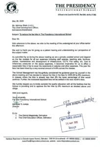 *द प्रसिडेंसी इन्टरनेशनल स्कूल, भनियावाला का लिखित रूप से फीस कम करने का जिला प्रशासन को पत्र