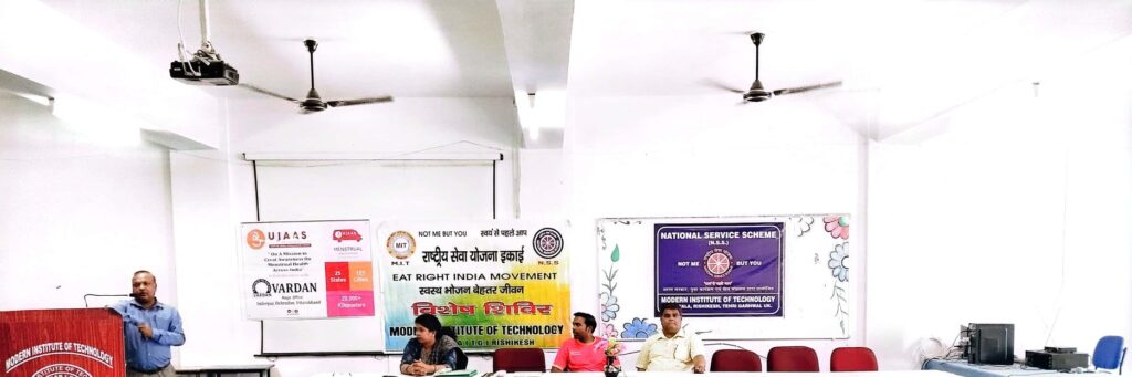 कार्यक्रम में महिलाओं के मासिक स्वास्थ्य के बारे में जानकारी दी गई, जिसमें नुक्कड़ नाटक का भी उपयोग किया गया। शिविर में एमआईटी संस्थान ढालवाला एन.एस.एस. संयोजक डॉ. रितेश जोशी एवम मि. राजेश चौधरी, साथ ही मि. रवि कुमार,मिःअजय तोमर, मिस शिल्पी कुकरेजा, मिस प्रियंका देशवाल,मिस हर्षिता, अकांशा, निशा, शालिनी, आरती, पूजा पुरोहित आदि भी उपस्थित रहे।”